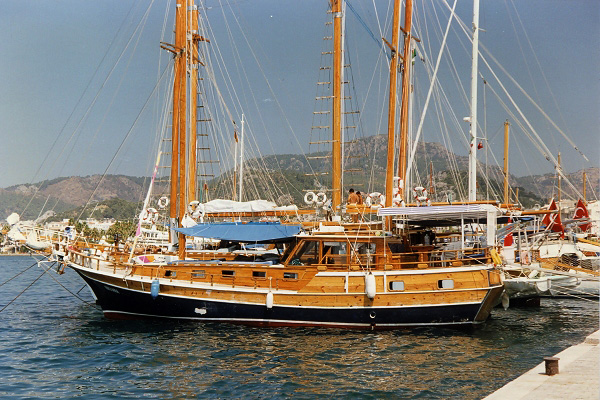 Vorbei an einem recht nobel aussehenden Harem gelangten wir dann noch zu dem eigentlichen Hafen von Marmaris. Die prächtigen Jachten ließen vermuten, über welche finanziellen Mittel so einige Türken verfügen. Gegen 14 Uhr knallte die Mittagssonne so erbarmungslos auf uns nieder, dass wir uns mit je einer Flasche Wasser in den Schatten eines Hafengebäudes setzten und so die verbleibenden zwei Stunden bis zur Überfahrt nach Rhodos verbringen wollten.